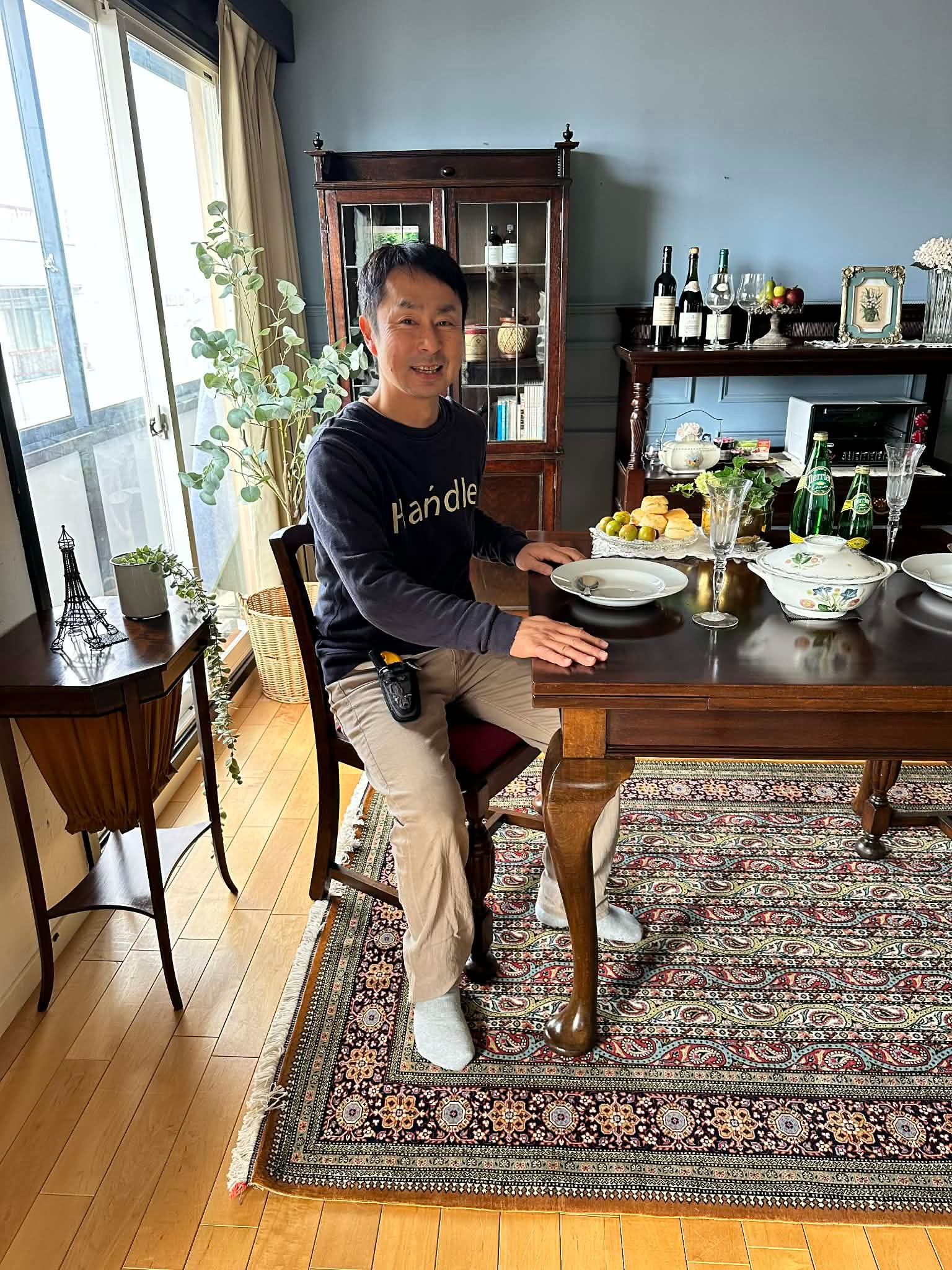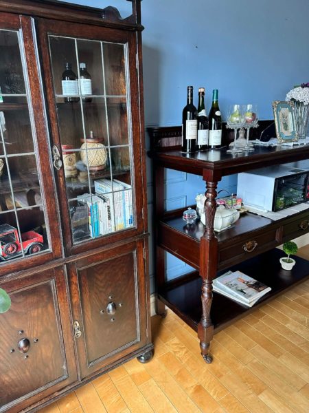 マホガニーのドローリーフテーブルにダムウエイターやオークのキャビネットを合わせてコーディネート。