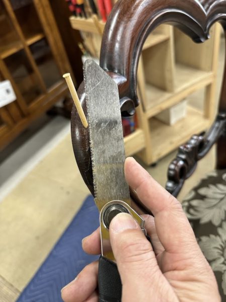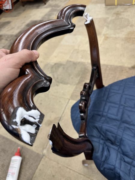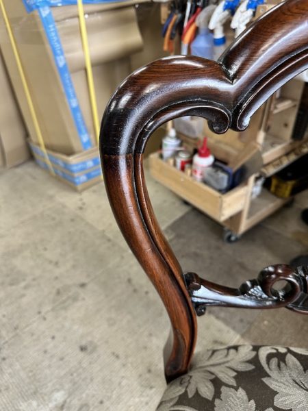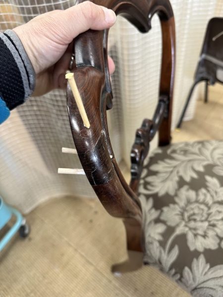 背もたれの木部が薄いので強度を保ちながらの難しい修復です。