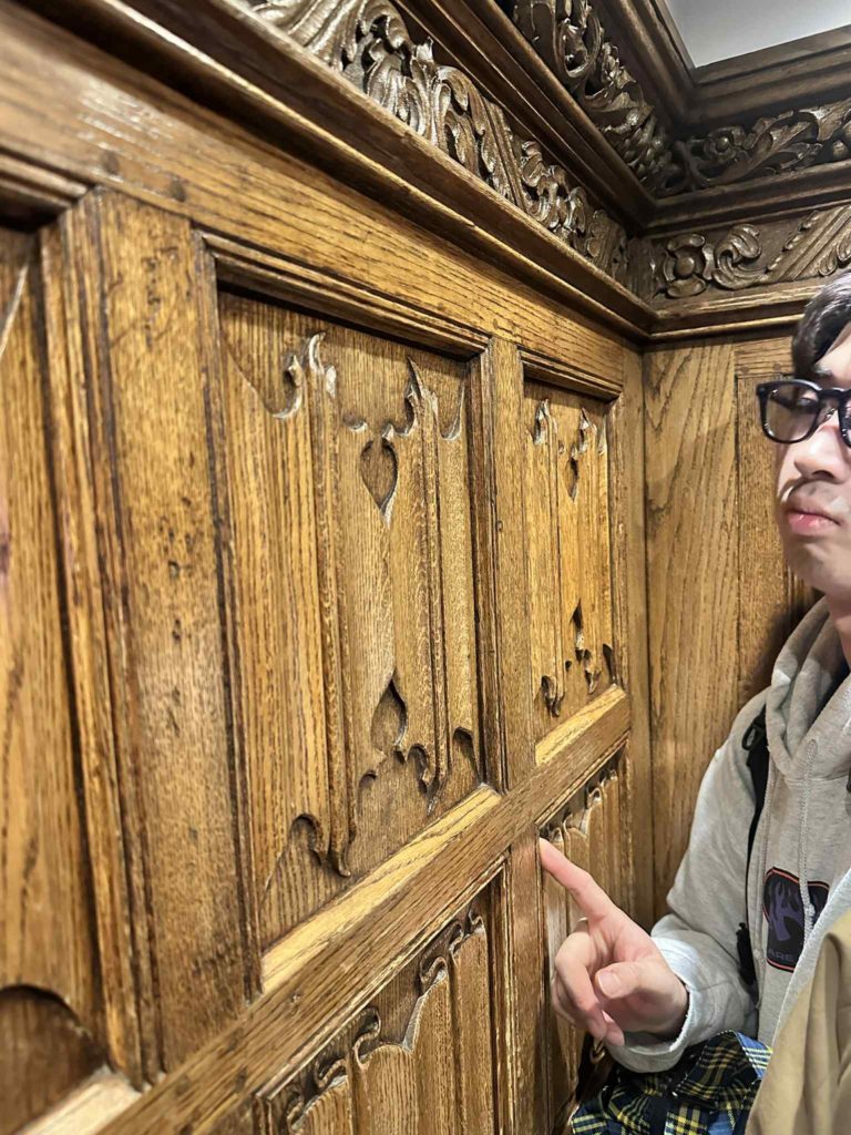 この壁の彫刻! これは「リネンフォールド」と言って、アンティーク家具でも使われている布を折りたたんだような伝統的なデザインです。