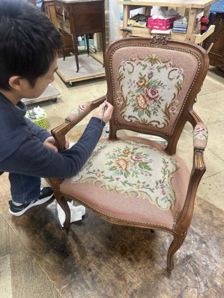 僕はフランスのプチポアンチェアーの修復作業。